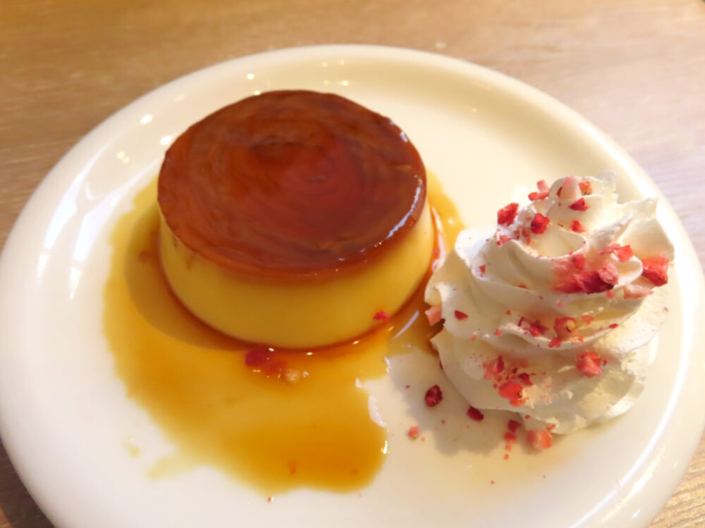 昨今トレンドの硬めのプリンにたっぷりホイップクリーム。